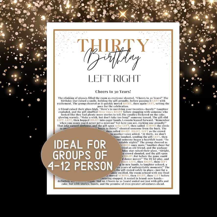 Celebrating the big 3-0 deserves something special. This Left Right birthday game brings guests together as they pass gifts, laugh at the story, and enjoy a lighthearted way to celebrate the guest of honor. Easy to play and fun for all ages, it’s the perfect icebreaker for your party.