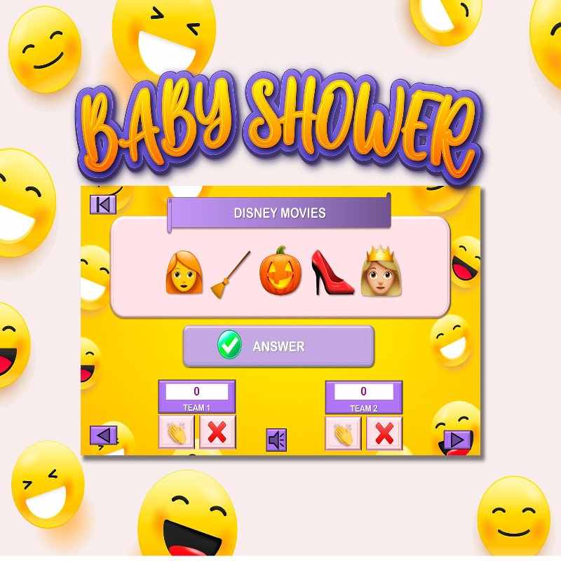 If you like fun, you've found the right game! Test your knowledge, logic, and reasoning skills with this enjoyable Baby Shower Guess Emoji Battle. This emoji guessing game is a PowerPoint game where contestants try to guess the words represented by emojis. The team with the highest score wins the game.