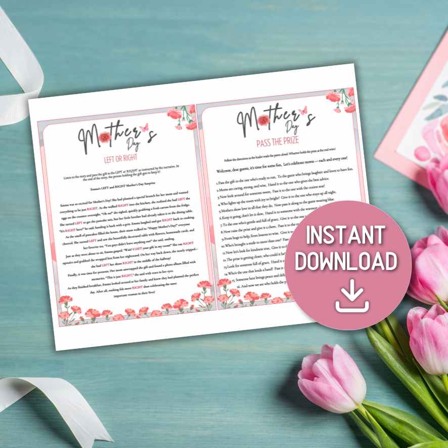 Looking to add some laughter and heartwarming moments to your Mother’s Day celebration? 💕 This Mother’s Day Party Games Printable set is your perfect go-to! Featuring two fun and interactive games – Left or Right and Pass the Prize – this charming bundle is ideal for family gatherings, brunches, or classroom parties. Easy to download and print at home, these games are sure to bring smiles and create lasting memories. ✨