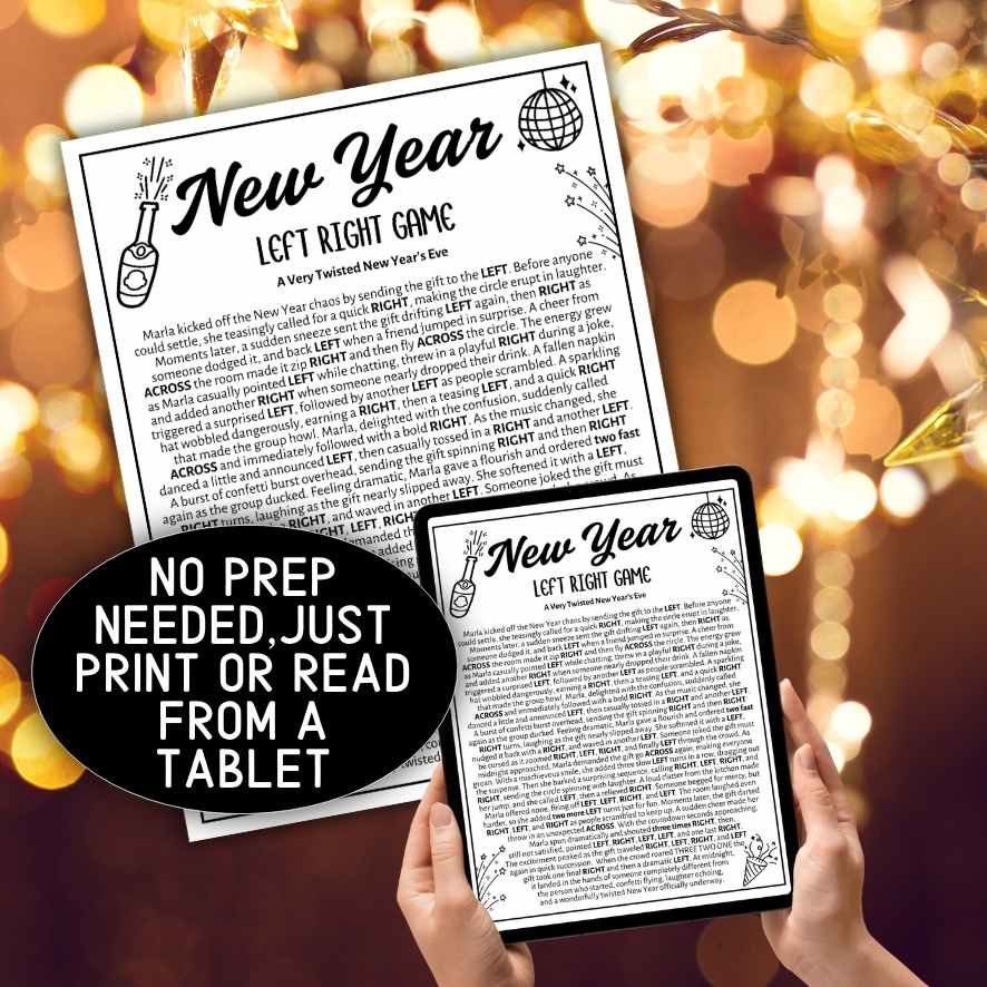 New Yearâs Left Right Game Printable is the perfect way to bring laughter, excitement, and energy to your New Yearâs Eve celebration! This festive, story-based pass-the-gift game keeps guests on their toes as they listen closely for the words LEFT and RIGHT while passing a gift around the circle. Whether you're hosting a cozy family gathering or a big countdown celebration with friends, this printable game guarantees instant fun for all ages.