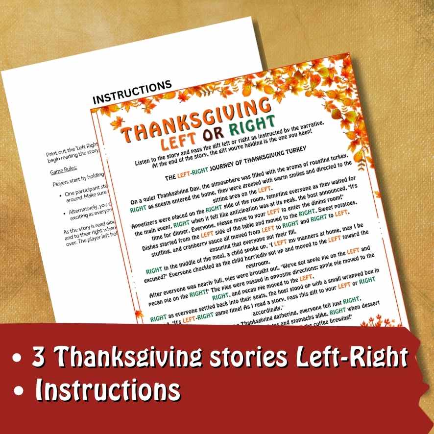 Add a sprinkle of gratitude to your Thanksgiving celebrations with our Thanksgiving Left Right Gratitude Game! In this family-friendly game, participants pass gifts to the left or right as they listen to a heartwarming Thanksgiving tale filled with appreciation and surprises. Who will be the lucky one to receive the special gift? The suspense will have everyone eagerly awaiting the conclusion!